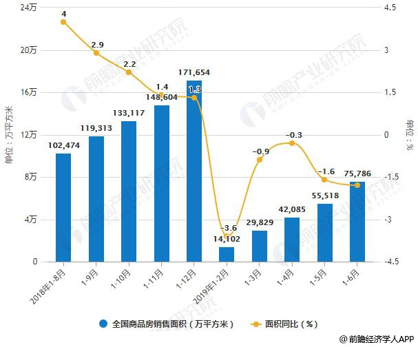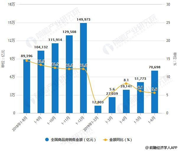 2018-2019年前6月全國商品房銷售面積、銷售金額統(tǒng)計及增長情況