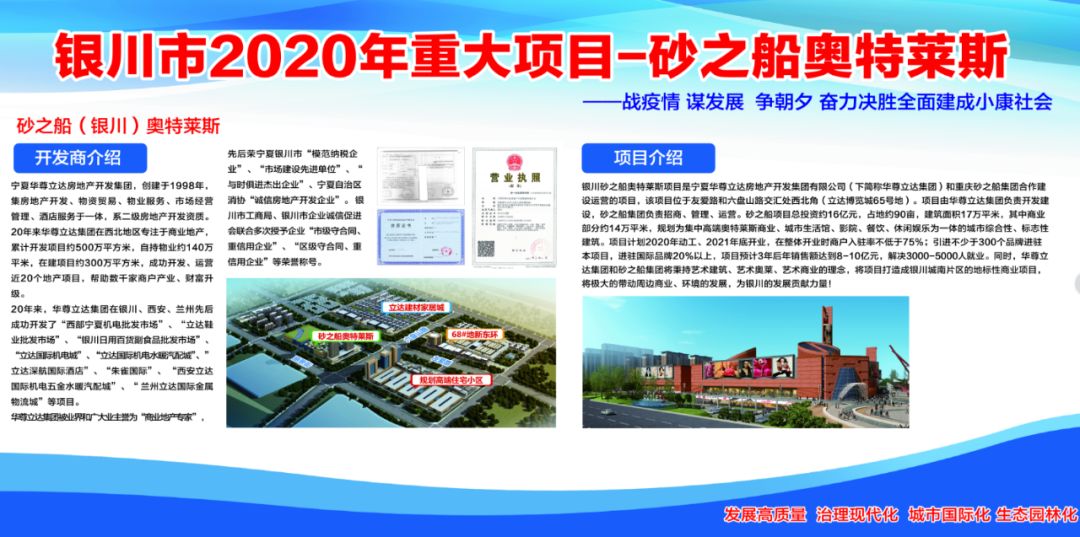 砂之船(銀川)奧特萊斯項目是銀川市2020年重大項目。項目由寧夏華尊立達房地產(chǎn)開發(fā)集團有限公司和重慶砂之船集團合作建設(shè)運營,該項目位于友愛路和六盤山路交匯處西北角(立達博覽城65號地)。項目由華尊立達集團負(fù)責(zé)開發(fā)建設(shè),砂之船集團負(fù)責(zé)招商、管理、運營。