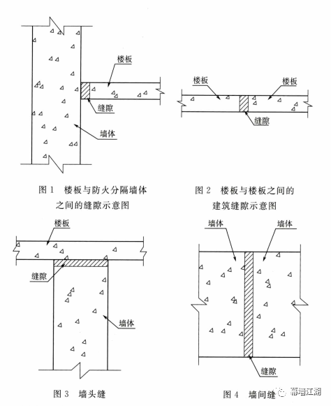 2.0.2 建筑結(jié)構(gòu)或構(gòu)件之間的縫隙包括防火隔墻之間的縫隙、防火隔墻與樓板之間的縫隙、建筑幕墻與樓板之間的縫隙等,還包括伸縮縫、沉降縫、抗震縫等建筑變形縫隙。
