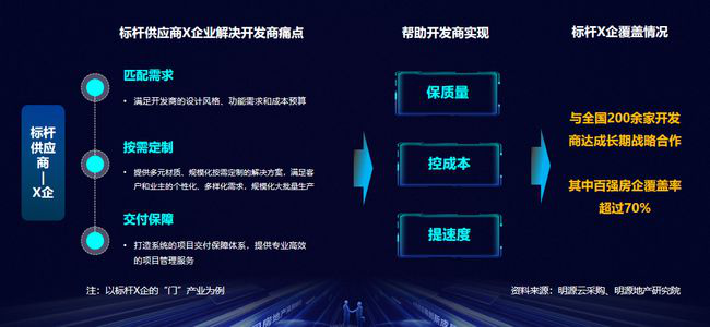 第二,聯(lián)合采購(gòu)或者說(shuō)與采購(gòu)聯(lián)盟戰(zhàn)略合作,并基于此平臺(tái)實(shí)現(xiàn)與多家房企的流程對(duì)接。目前聯(lián)合采購(gòu)面臨的關(guān)鍵問(wèn)題是,需要建立起一個(gè)從框架協(xié)議、合同簽訂、生產(chǎn)供貨到驗(yàn)收結(jié)算的一體化平臺(tái),這樣聯(lián)合采購(gòu)才會(huì)真正落到實(shí)處。