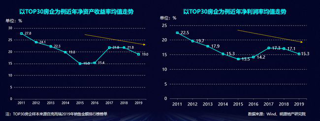 利潤(rùn)拐點(diǎn)方面,2020年之后,地產(chǎn)企業(yè)將難以兼顧利潤(rùn)和規(guī)模的雙豐收。TOP30房企為例,近年凈資產(chǎn)收益率、凈利潤(rùn)率均值走勢(shì)都在下降。很多地產(chǎn)企業(yè)內(nèi)部都提出了挖山填海的戰(zhàn)略,什么是?其實(shí)就是虧損的海。利潤(rùn)拐點(diǎn)可以從財(cái)報(bào)體現(xiàn)出來(lái),到明年利潤(rùn)的反轉(zhuǎn)就會(huì)很明顯了。