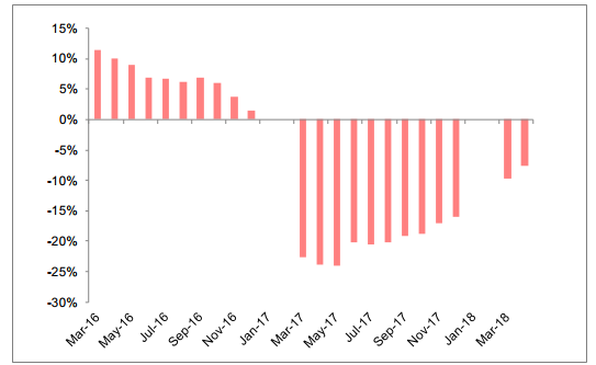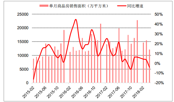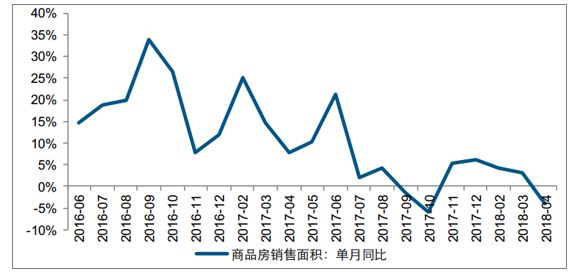 截至 2018 年 4 月,商品房銷售面積單月同比增速進入負增長區(qū)間