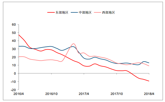 2015 年至 2017 年,是城市需求熱度從東部向中西部蔓延的過程,三四線城市銷售也高歌猛進,成交創(chuàng)歷史新高。而進入 2018 年后,這種熱度蔓延的趨勢進一步擴散、 進一步下沉,但增速呈現(xiàn)放緩。前 4 月全國商品房銷售面積僅同比增長 1.3%, 4 月單月同比增速已轉為負增長。分結構來看,增速下滑的主要原因是東部尤其是三四線城市開始面臨增速回落,相對而言中西部三四線城市的熱度依然維持,這也符合近期調研的結論。