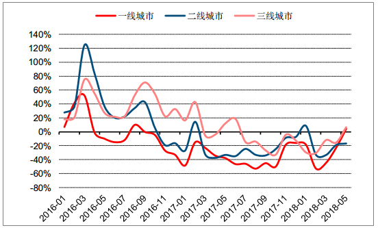 積極的因素體現(xiàn)在重點一二線城市,雖然整體還是處于負增長區(qū)間,但是降幅在二季度開始明顯收窄,一線城市也是在 5 月近兩年以來首次重歸正增長。一二線城市和三四線城市的增速差在經(jīng)歷了 2017 年的持續(xù)擴大后,在 2018 年重新收斂。
