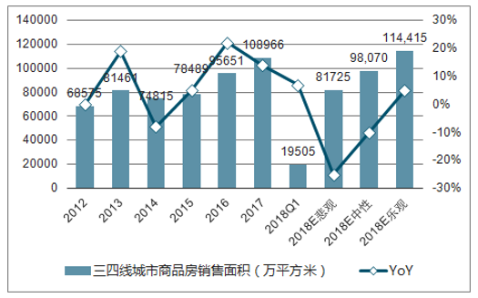 2018年中國三四線城市商品房銷售面積及增速展望