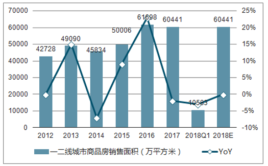 2018年中國一二線城市商品房銷售面積及增速展望